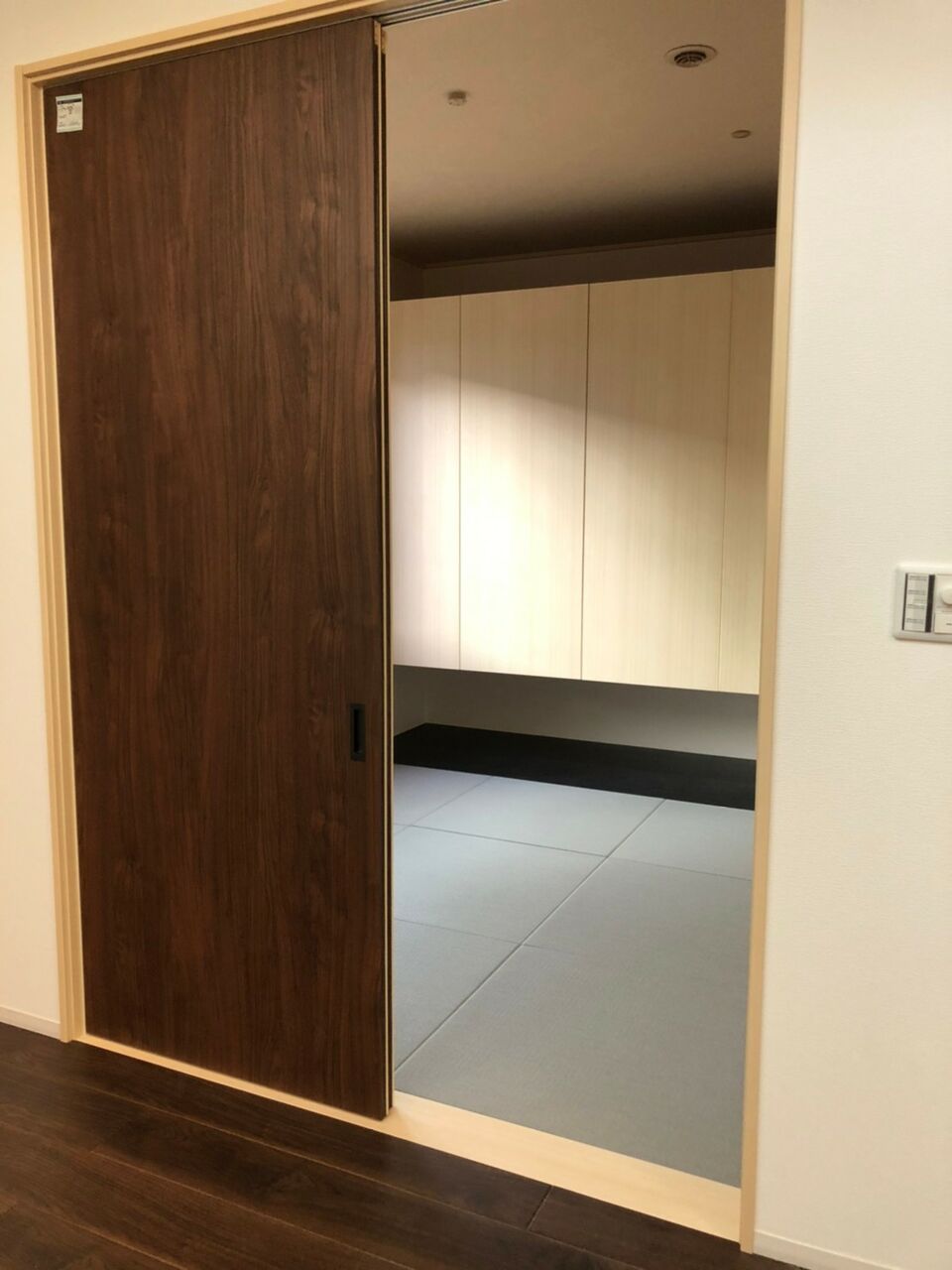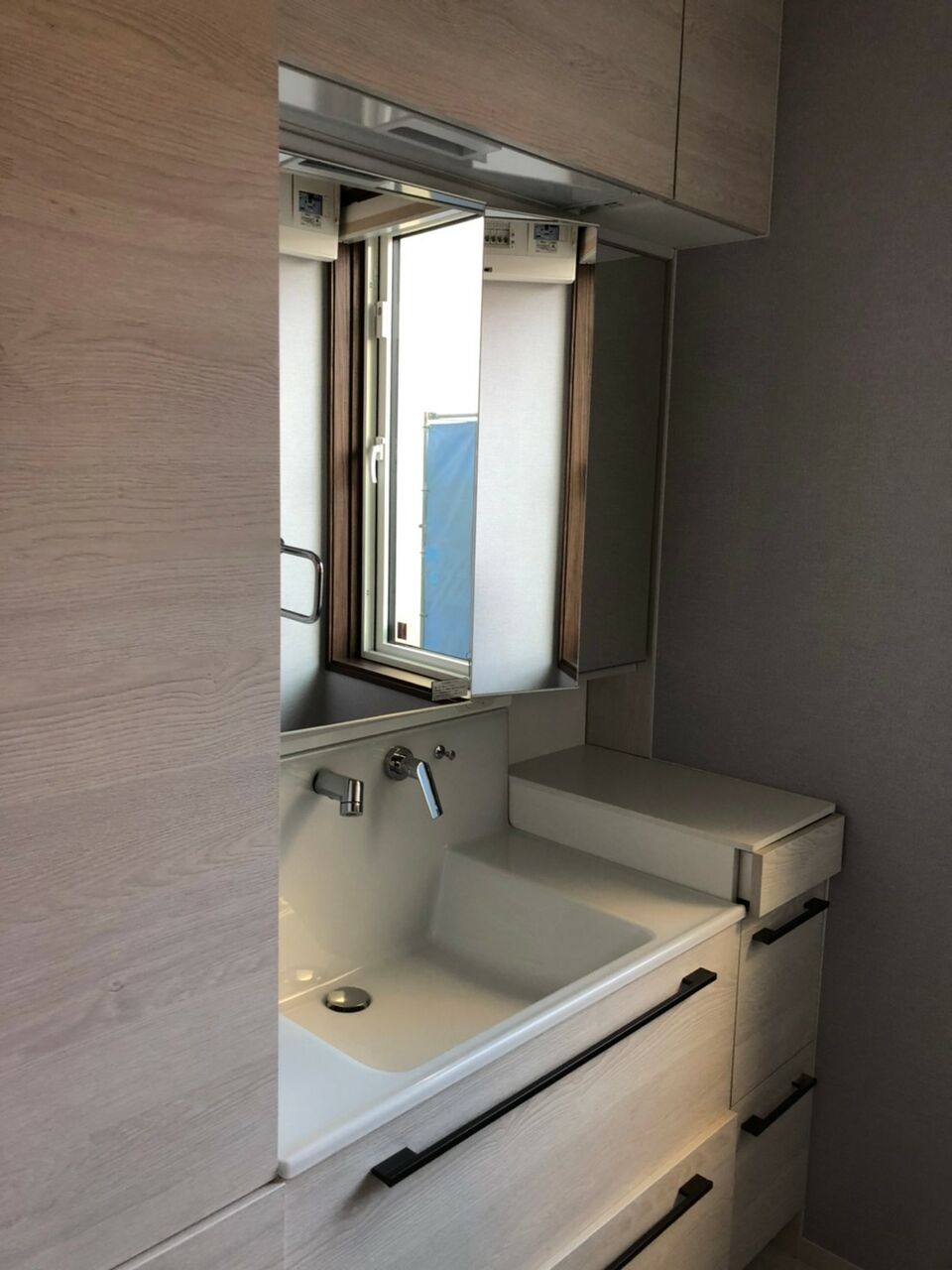銀鼠、ブラックの石目調タイル、ヒノキの吊収納。